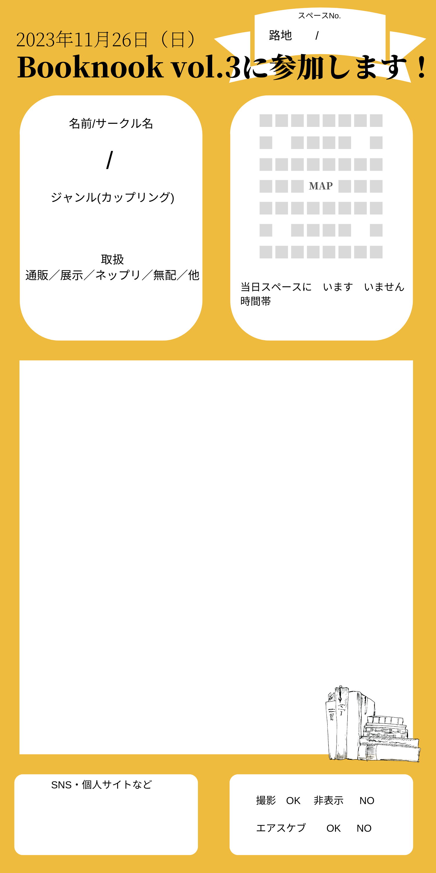 当日のお品書きにも反映されるように申込みの設問として設けてもいますので、申込み後に発行物の内容に変更があった場合なども、申込み締切日までは変更可能ですので頒布物の傾向などをお書き添え頂けると助かります。